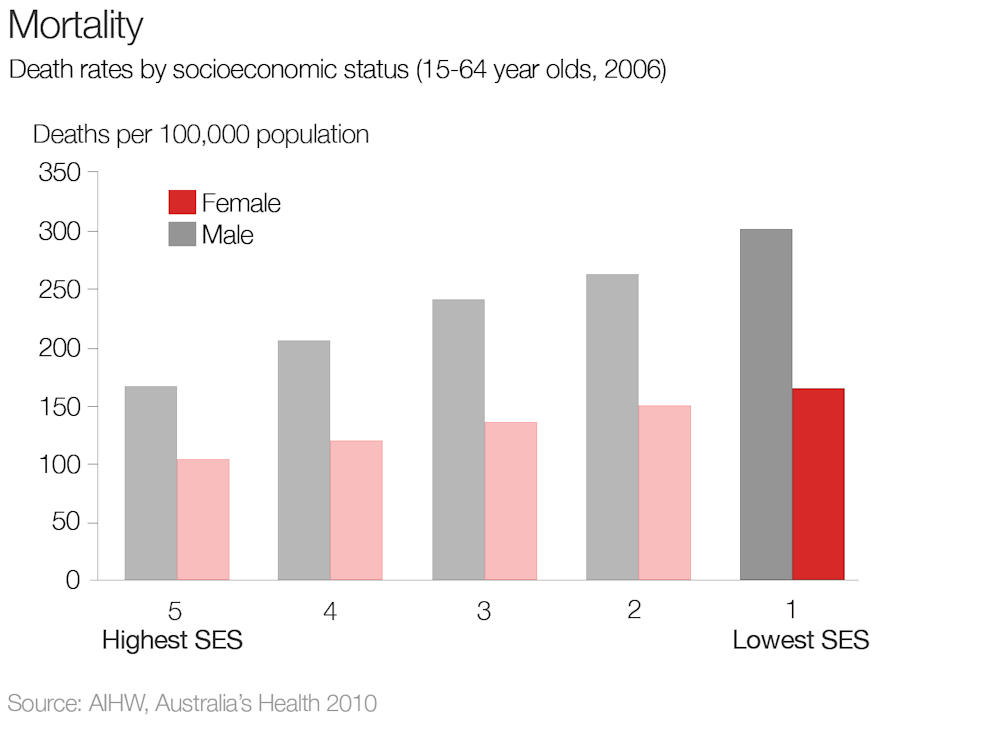 This pervasive pattern of greater morbidity and earlier mortality associated with lower income education or occupational status per-. The pattern of association between social class or status and health is typically characterized by poorer health for those at lower levels of the social hierarchy1415that is health outcomes follow a social gradient. This is a global phenomenon seen in low middle and high income countries.